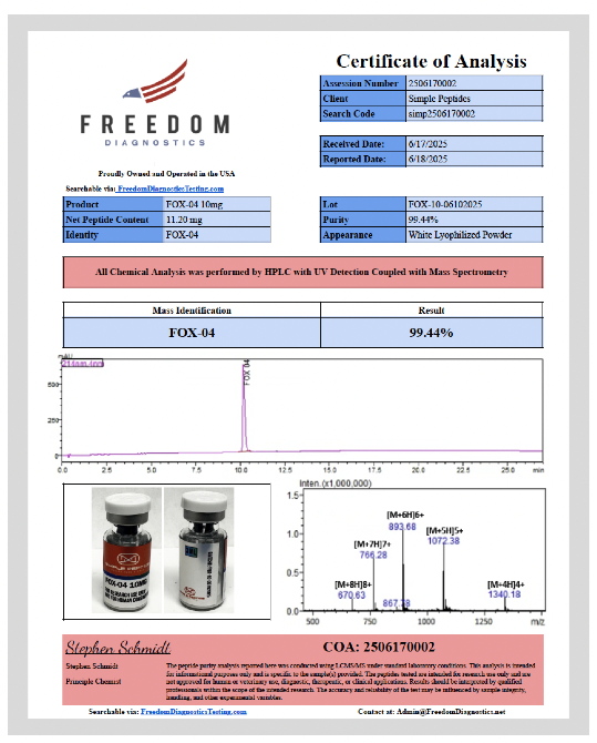 Each batch of FOXO4-DRI Peptide meets pharmaceutical-grade quality standards to support consistency and reliability in research supply. Independent testing and batch documentation allow researchers to review material specifications prior to use. Each shipment includes a Certificate of Analysis that supports batch verification and material transparency.