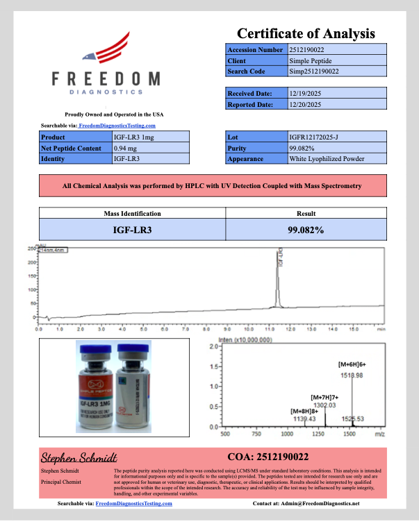 IGF-1 LR3 is provided strictly for research use only. Researchers must not use this product for human or animal use, clinical applications, diagnostic purposes, or consumption. Qualified professionals must conduct all research in appropriate laboratory environments and in compliance with applicable regulations and guidelines.