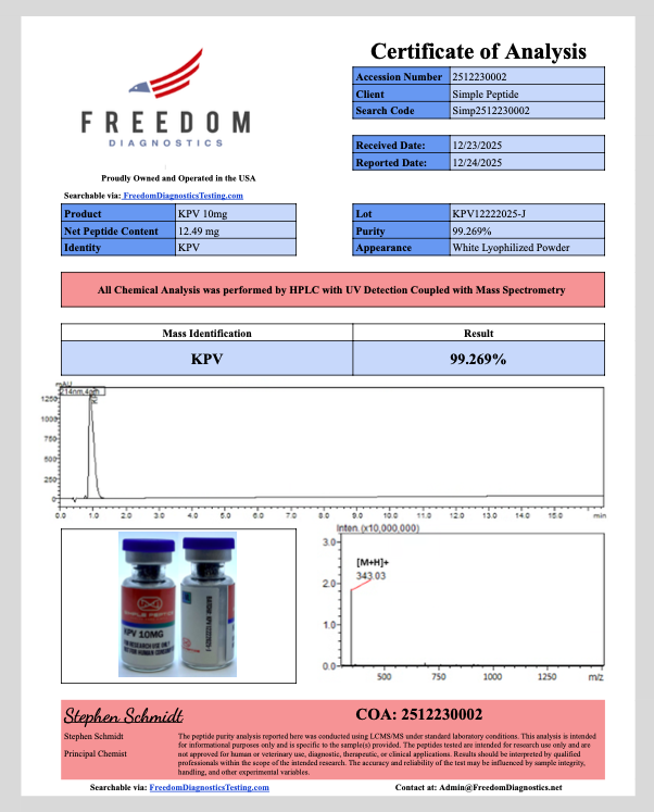 Ongoing scientific research continues to include KPV in peptide focused laboratory studies. Researchers incorporate this peptide into experimental designs that examine signaling pathways, interaction dynamics, and controlled molecular behavior. Its defined structure and reliable handling characteristics make it suitable for both exploratory studies and detailed research programs.